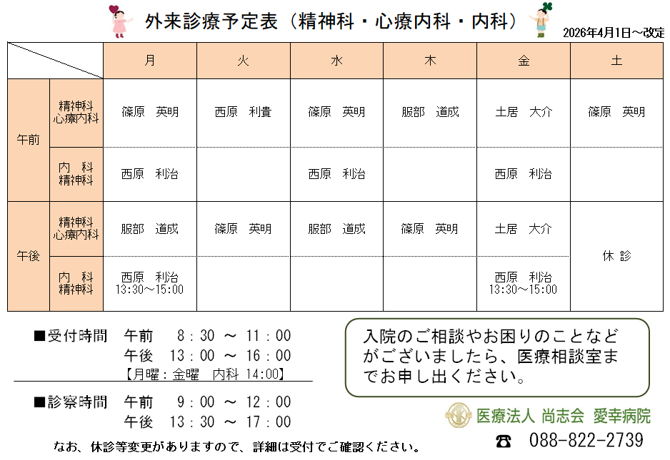 初診の患者様で精神科をご希望の方は、受診いただく前に電話でのお問い合わせをお願いいたします。